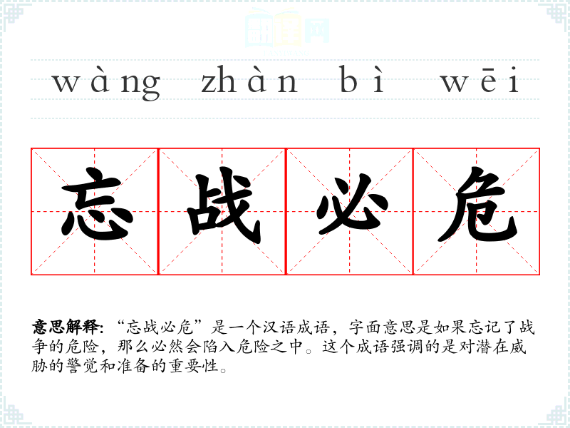 “忘战必危”是一个汉语成语,字面意思是如果忘记了战争的危险,那么必然会陷入危险之中。这个成语强调的是对潜在威胁的警觉和准备的重要性。