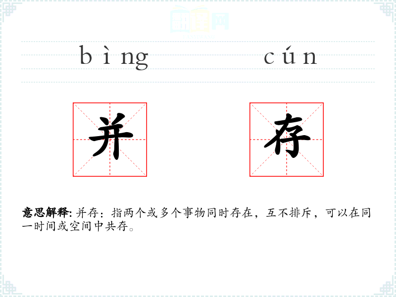 “并存”一词由“并”和“存”两个字组成。“并”意为一起、同时,“存”意为存在。在古代汉语中,“并”常用于表示并列或同时,而“存”则表示存在或保留。随着语言的发展,“并存”逐渐被用来描述同时存在的状态。