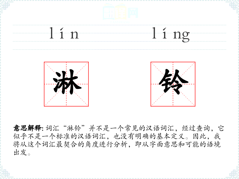 结合这两个字,我们可以推测“淋铃”可能指的是某种与铃声相关的液体落下情景,但这种解释非常模糊,因为没有确切的语境支持。