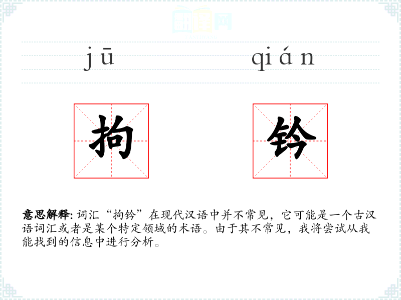 词汇“拘钤”在现代汉语中并不常见,它可能是一个古汉语词汇或者是某个特定领域的术语。由于其不常见,我将尝试从我能找到的信息中进行分析。