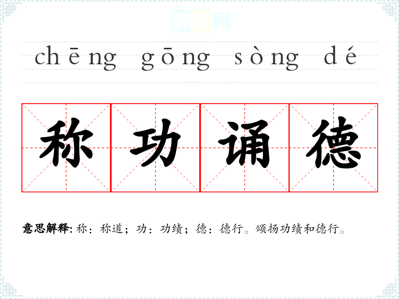 称:称道;功:功绩;德:德行。颂扬功绩和德行。