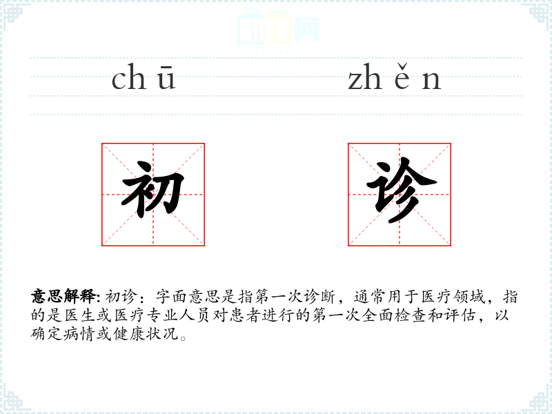 初诊:字面意思是指第一次诊断,通常用于医疗领域,指的是医生或医疗专业人员对患者进行的第一次全面检查和评估,以确定病情或健康状况。
