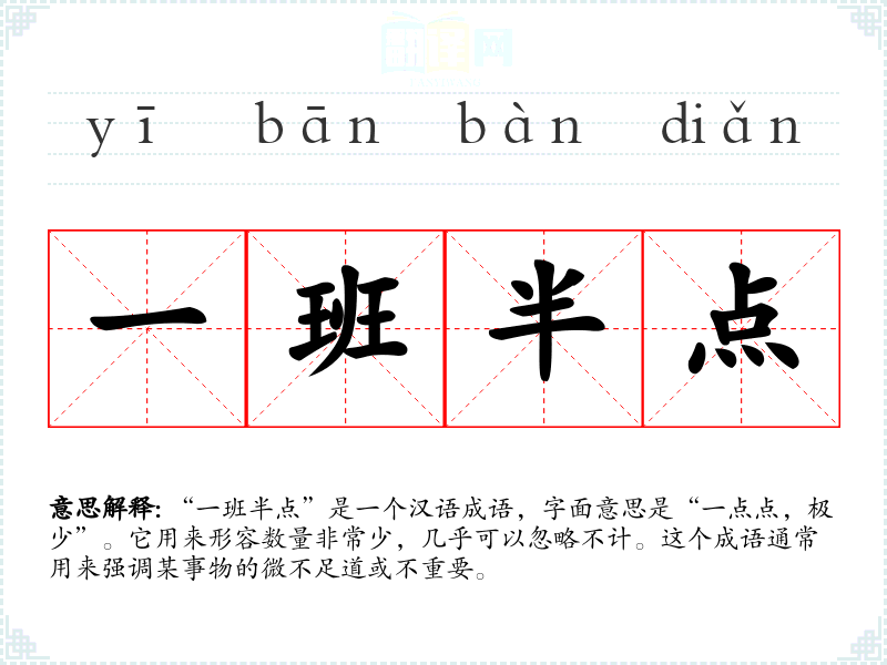 “一班半点”是一个汉语成语,字面意思是“一点点,极少”。它用来形容数量非常少,几乎可以忽略不计。这个成语通常用来强调某事物的微不足道或不重要。