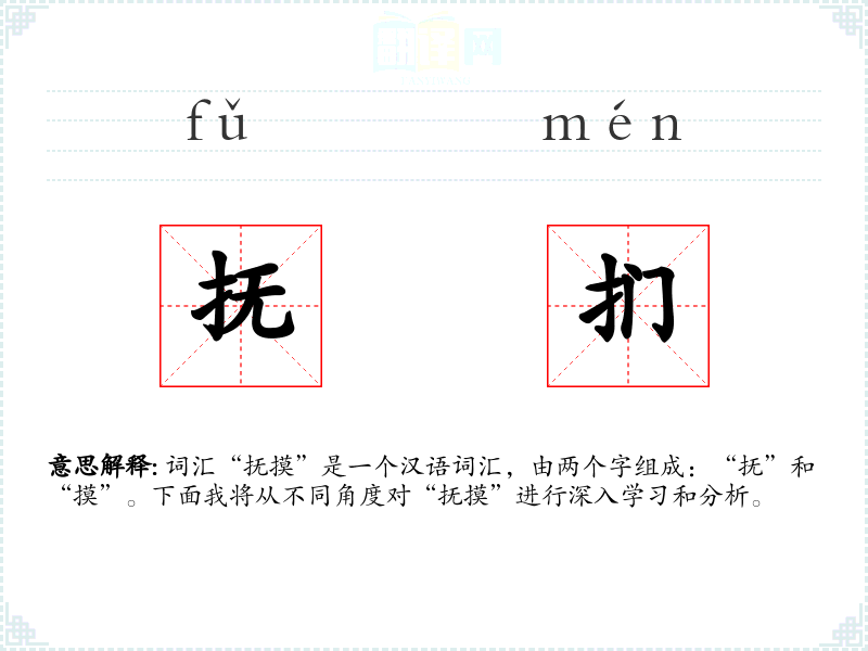 “抚”字古汉语中意为安抚、安慰,“摸”字则指用手接触或轻轻移动。两个字结合,形成了“抚摸”这一表达温柔触碰的词汇。
