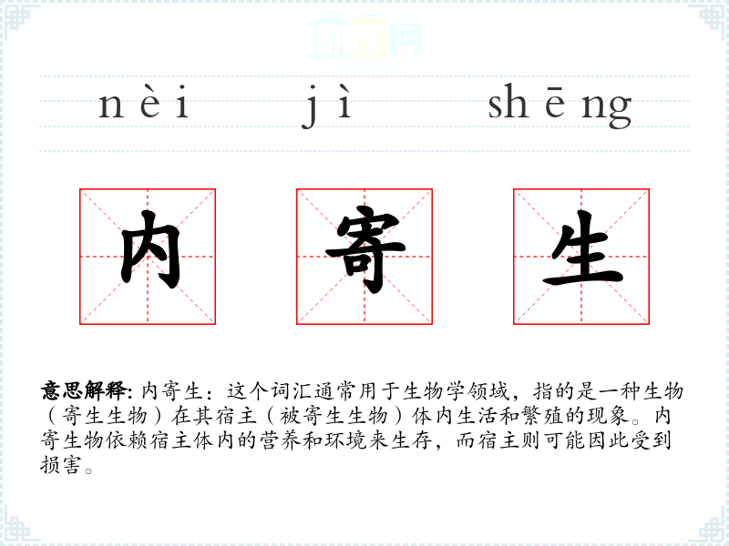 - 反义词:外寄生(指寄生生物在宿主体外生活)