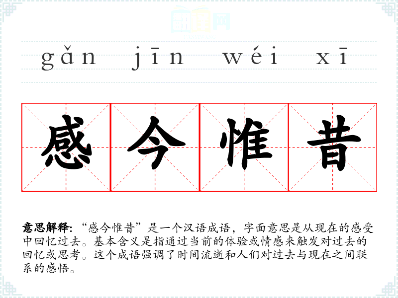 “感今惟昔”这个成语的词源较为模糊,但它体现了汉语中对时间流逝和回忆的深刻理解。在古代文学作品中,类似的表达方式就已经出现,随着时间的推移,这个成语逐渐被广泛使用并固定下来。
