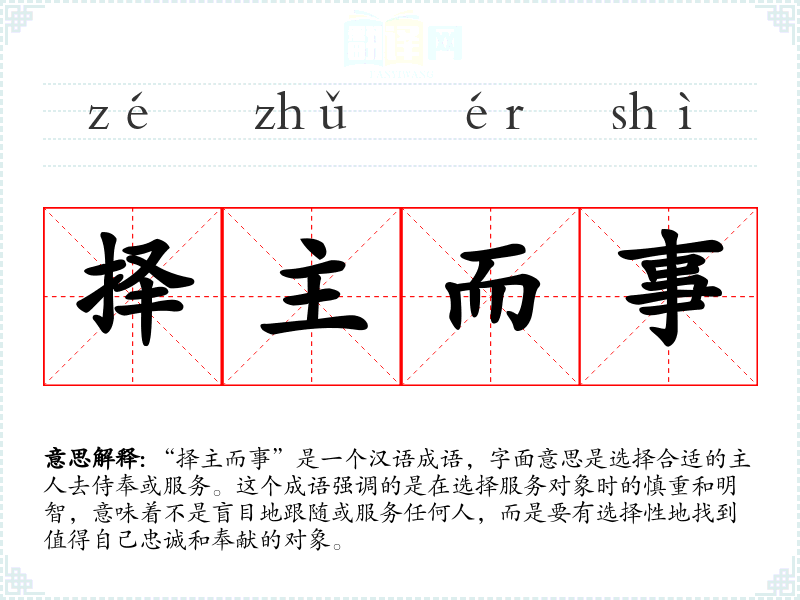 “择主而事”是一个汉语成语,字面意思是选择合适的主人去侍奉或服务。这个成语强调的是在选择服务对象时的慎重和明智,意味着不是盲目地跟随或服务任何人,而是要有选择性地找到值得自己忠诚和奉献的对象。