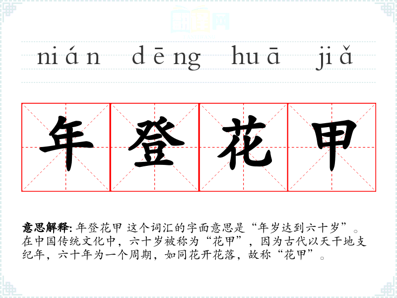 年登花甲 这个词汇的字面意思是“年岁达到六十岁”。在**传统文化中,六十岁被称为“花甲”,因为古代以天干地支纪年,六十年为一个周期,如同花开花落,故称“花甲”。