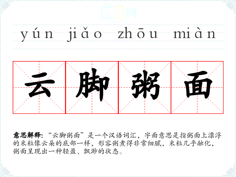 “云脚粥面”是一个汉语词汇,字面意思是指粥面上漂浮的米粒像云朵的底部一样,形容粥煮得非常细腻,米粒几乎融化,粥面呈现出一种轻盈、飘渺的状态。