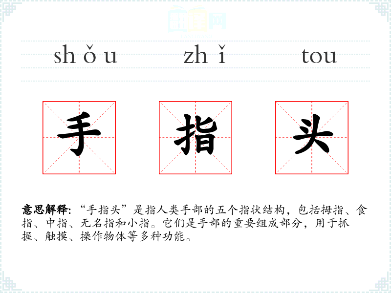 同义词:手指、指头 反义词:(由于“手指头”是具体的人体部位,通常没有直接的反义词)