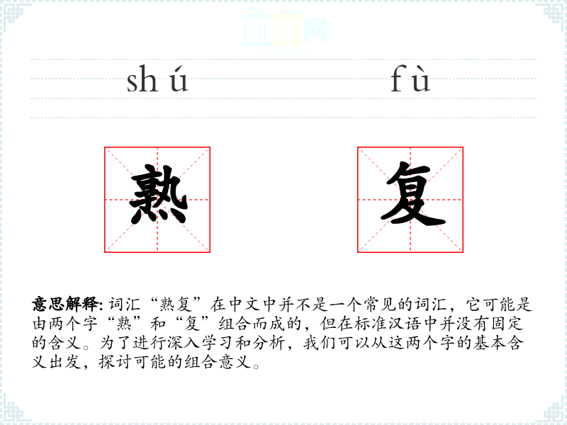 词汇“熟复”在中文中并不是一个常见的词汇,它可能是由两个字“熟”和“复”组合而成的,但在标准汉语中并没有固定的含义。为了进行深入学习和分析,我们可以从这两个字的基本含义出发,探讨可能的组合意义。