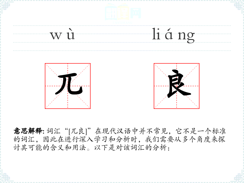 由于“[兀良]”不是一个标准的汉语词汇,我们无法给出一个确切的字面意思和基本含义。它可能是一个方言词汇、古汉语词汇或者是某个特定社群中的俚语。