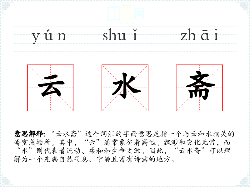 “云水斋”这个词汇的字面意思是指一个与云和水相关的斋室或场所。其中,“云”通常象征着高远、飘渺和变化无常,而“水”则代表着流动、柔和和生命之源。因此,“云水斋”可以理解为一个充满自然气息、宁静且富有诗意的地方。