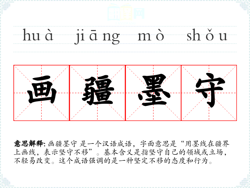 在英语中,画疆墨守 可以对应到“stand firm”或“hold the line”,虽然这些表达没有直接对应的文化背景,但传达的坚定不移的含义是相似的。