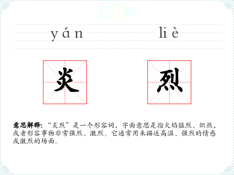 在英语中,类似的词汇可能是“fiery”或“intense”,它们在描述强烈、激烈的事物时与“炎烈”有相似的含义。