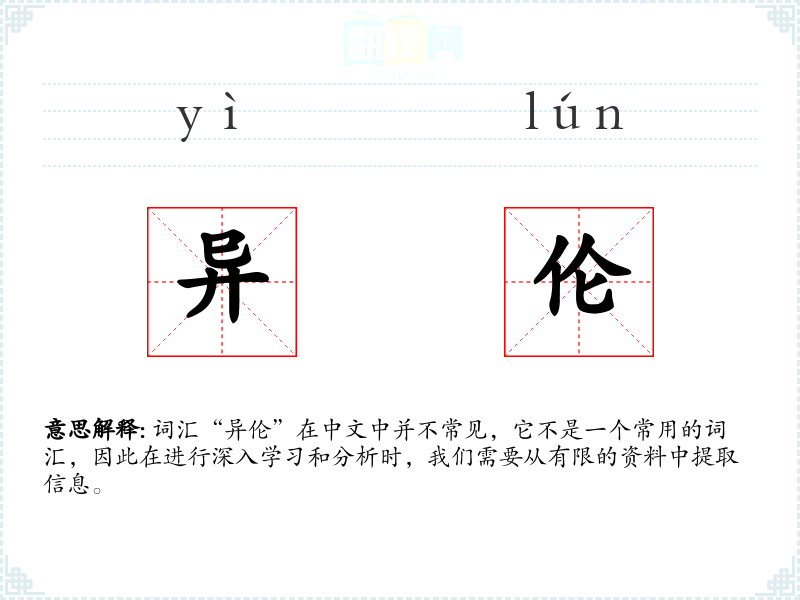 “异伦”由“异”和“伦”两个字组成。“异”表示不同,“伦”在古代汉语中指类别或秩序。随着时间的推移,这个词汇的使用频率逐渐降低,现代汉语中很少使用。