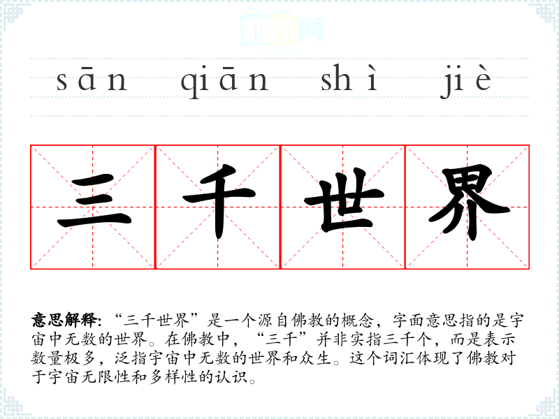 “三千世界”源自经典,特别是《华严经》中提到的“三千大千世界”。随着的传播,这个概念也被引入到其他文化和语言中,但其核心意义保持不变,即宇宙的无限性和多样性。