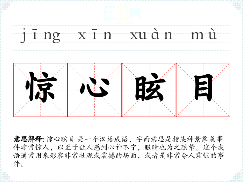 惊心眩目 是一个汉语成语,字面意思是指某种景象或非常惊人,以至于让人感到心神不宁,眼睛也为之眩晕。这个成语通常用来形容非常壮观或震撼的场面,或者是非常令人震惊的。