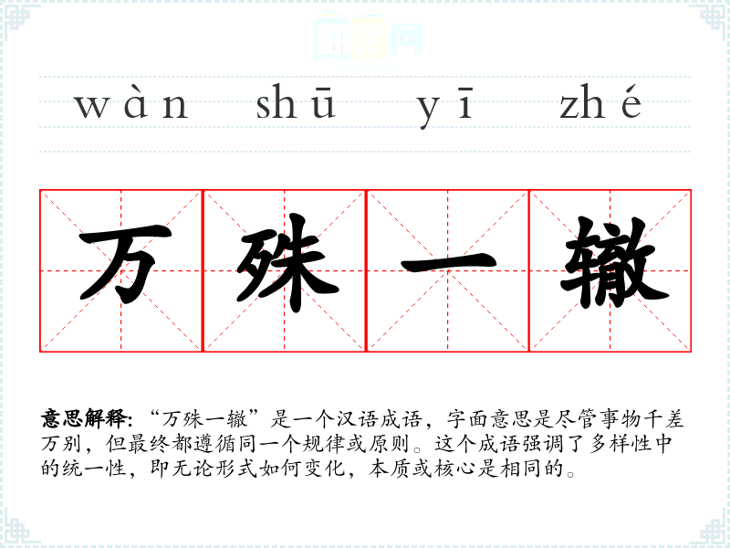 “万殊一辙”是一个汉语成语,字面意思是尽管事物千差万别,但最终都遵循同一个规律或原则。这个成语强调了多样性中的统一性,即无论形式如何变化,本质或核心是相同的。