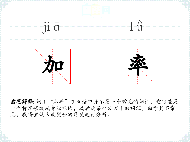 由于“加率”不是一个通用词汇,其词源和演变可能不为人所熟知。它可能是由“加”(增加)和“率”(比率、速率)组合而成的复合词。