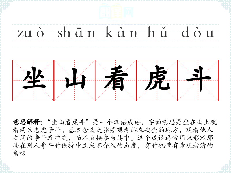 “坐山看虎斗”这个成语不仅是一个描述旁观者态度的词汇,它还蕴含了智慧、策略和中庸之道的哲学。在语言学*和表达中,理解和运用这个成语可以帮助我们更好地处理复杂的人际关系和冲突,同时也体现了语言的深度和文化内涵。