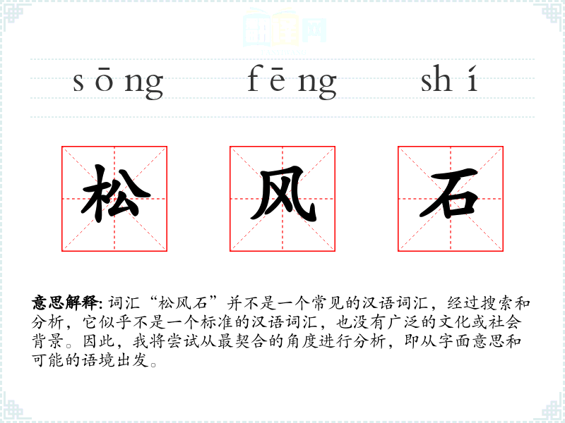 词汇“松风石”并不是一个常见的汉语词汇,经过搜索和分析,它似乎不是一个标准的汉语词汇,也没有广泛的文化或社会背景。因此,我将尝试从最契合的角度进行分析,即从字面意思和可能的语境出发。