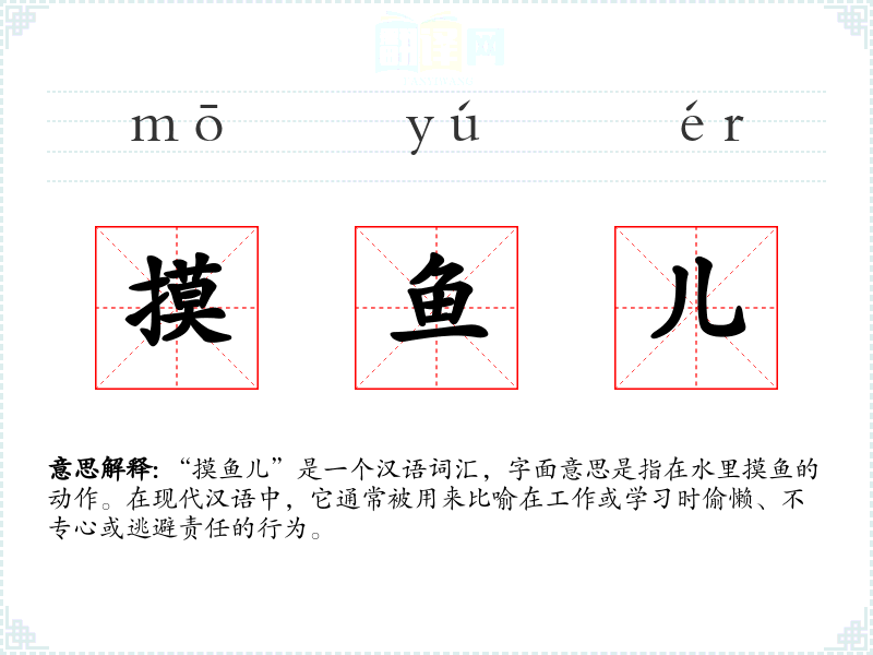 - 口语语境:在日常口语中,“摸鱼儿”常被用来调侃或自嘲,表示自己在工作或学*时没有尽全力。