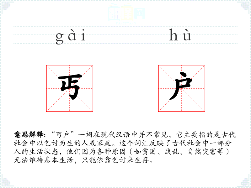 “丐户”一词在现代汉语中并不常见,它主要指的是古代社会中以乞讨为生的人或家庭。这个词汇反映了古代社会中一部分人的生活状态,他们因为各种原因(如贫困、战乱、自然灾害等)无法维持基本生活,只能依靠乞讨来生存。