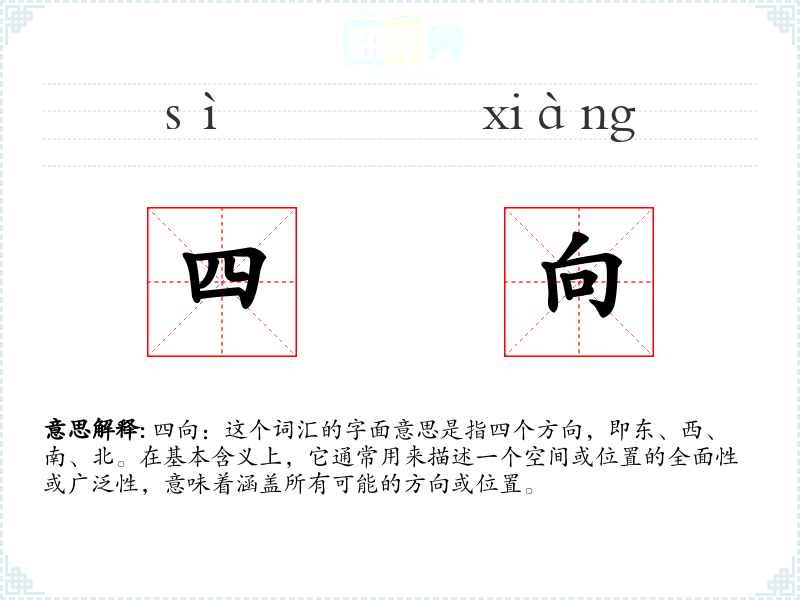 四向:这个词汇的字面意思是指四个方向,即东、西、南、北。在基本含义上,它通常用来描述一个空间或位置的全面性或广泛性,意味着涵盖所有可能的方向或位置。