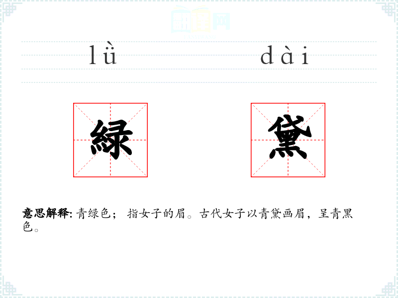 青绿色; 指女子的眉。古代女子以青黛画眉,呈青黑色。