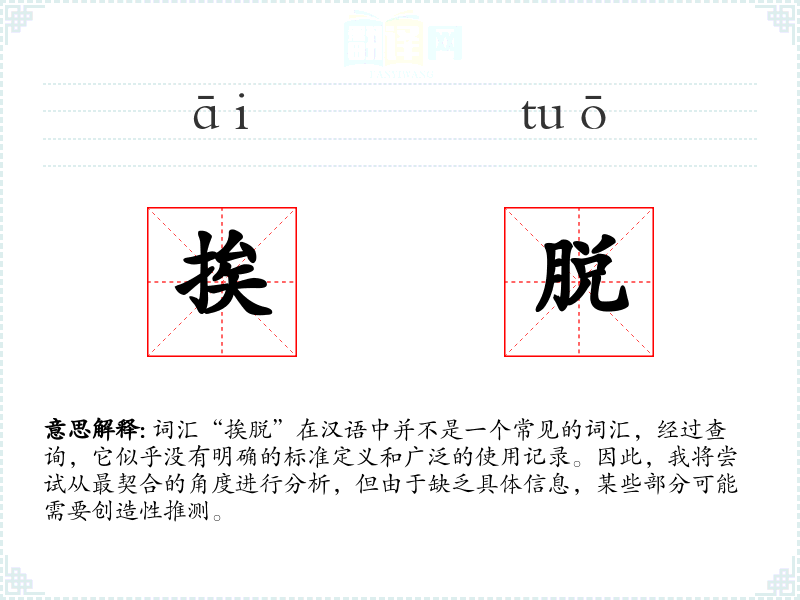 词汇“挨脱”在汉语中并不是一个常见的词汇,经过查询,它似乎没有明确的标准定义和广泛的使用记录。因此,我将尝试从最契合的角度进行分析,但由于缺乏具体信息,某些部分可能需要创造性推测。
