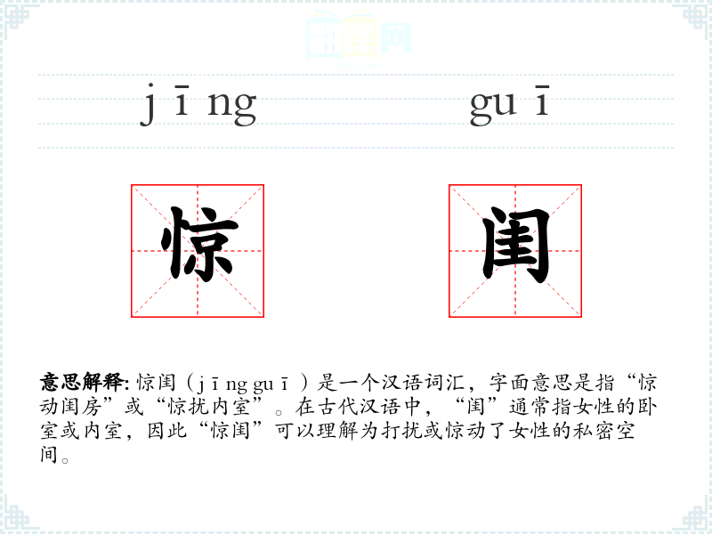 惊闺(jīng guī)是一个汉语词汇,字面意思是指“惊动闺房”或“惊扰内室”。在古代汉语中,“闺”通常指女性的卧室或内室,因此“惊闺”可以理解为打扰或惊动了女性的私密空间。