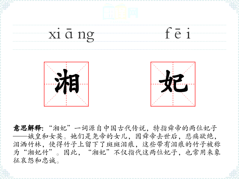 - 同义词:娥皇、女英(特指舜帝的妃子)
