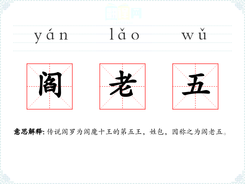 传说阎罗为阎魔十王的第五王,姓包,因称之为阎老五。