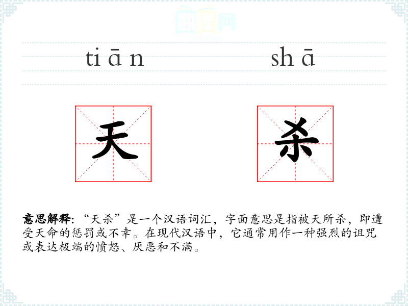 “天杀”是一个汉语词汇,字面意思是指被天所杀,即遭受天命的惩罚或不幸。在现代汉语中,它通常用作一种强烈的诅咒或表达极端的愤怒、厌恶和不满。
