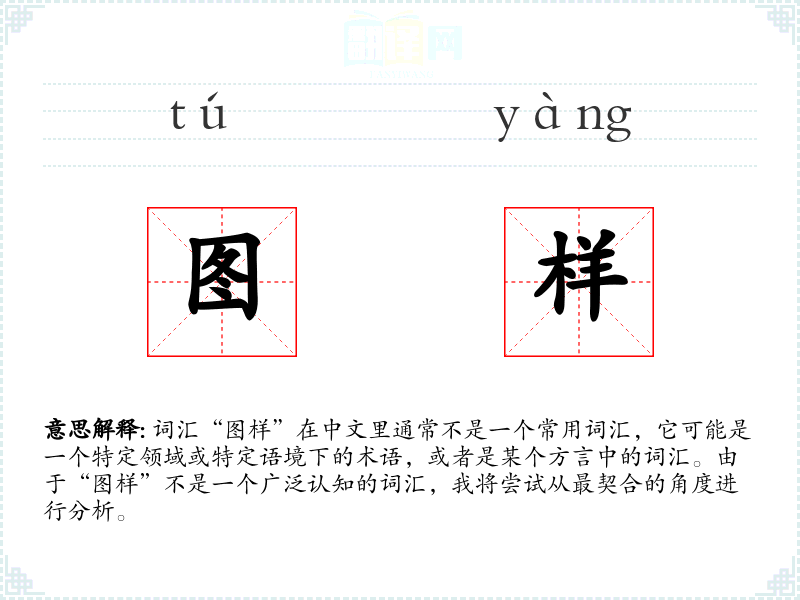 词汇“图样”在中文里通常不是一个常用词汇,它可能是一个特定领域或特定语境下的术语,或者是某个方言中的词汇。由于“图样”不是一个广泛认知的词汇,我将尝试从最契合的角度进行分析。