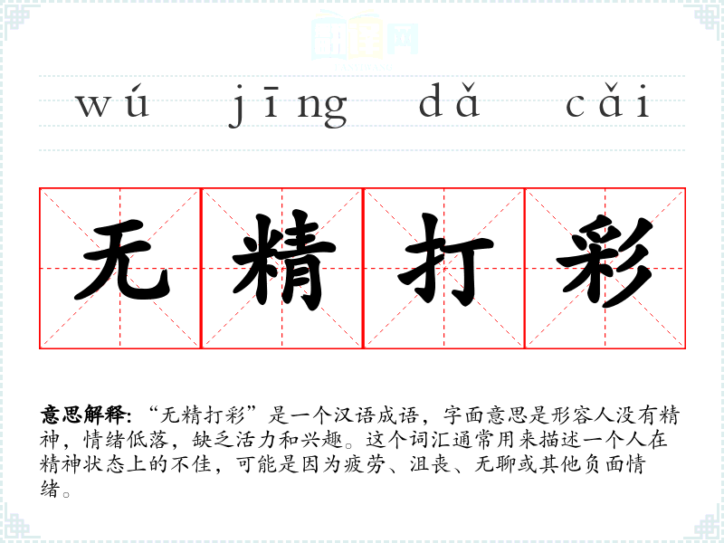“无精打彩”是一个汉语成语,字面意思是形容人没有精神,情绪低落,缺乏活力和兴趣。这个词汇通常用来描述一个人在精神状态上的不佳,可能是因为疲劳、沮丧、无聊或其他负面情绪。
