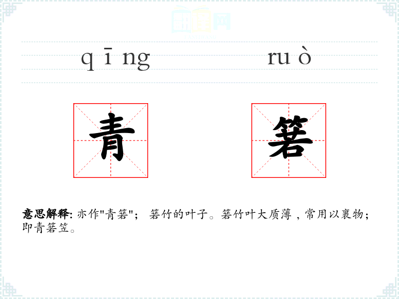 亦作"青箬"; 箬竹的叶子。箬竹叶大质薄﹐常用以裹物; 即青箬笠。