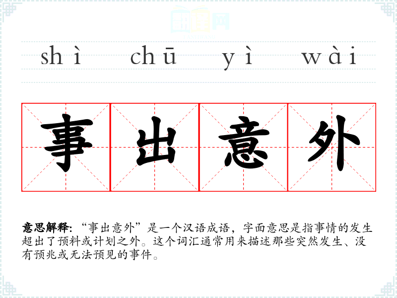 “事出意外”是一个汉语成语,字面意思是指事情的发生超出了预料或计划之外。这个词汇通常用来描述那些突然发生、没有预兆或无法预见的**。