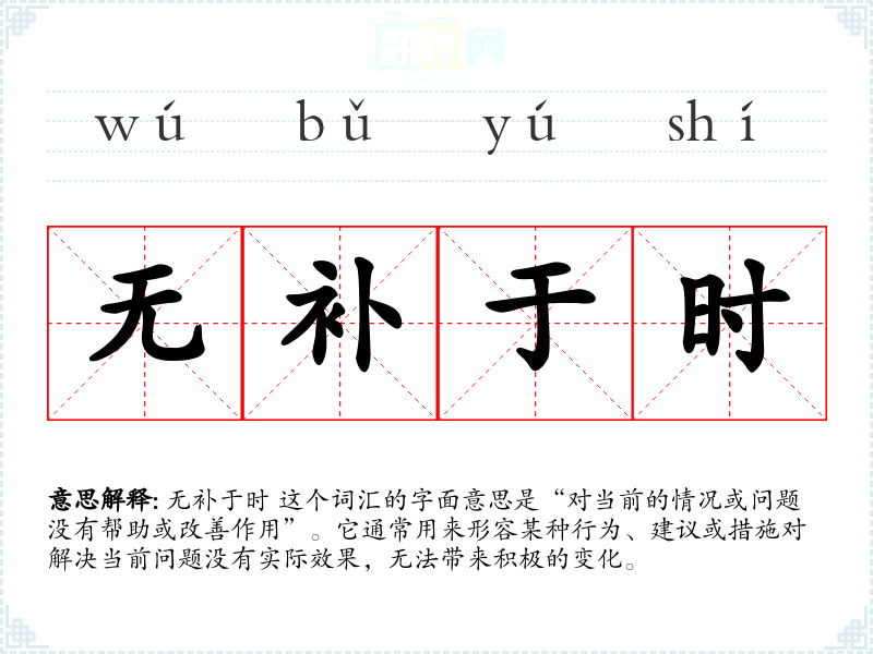 无补于时 这个词汇的字面意思是“对当前的情况或问题没有帮助或改善作用”。它通常用来形容某种行为、建议或措施对解决当前问题没有实际效果,无法带来积极的变化。