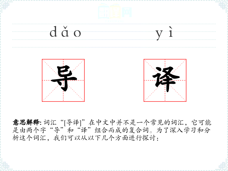 结合这两个字,“导译”可能指的是在翻译过程中提供指导或引导的行为,或者是指专门从事这种工作的人。