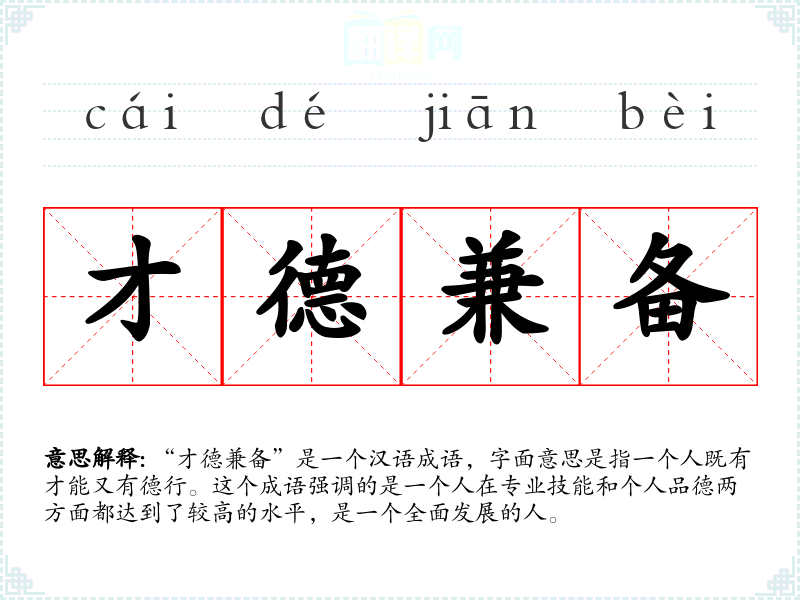 “才德兼备”是一个汉语成语,字面意思是指一个人既有才能又有德行。这个成语强调的是一个人在专业技能和个人品德两方面都达到了较高的水平,是一个全面发展的人。