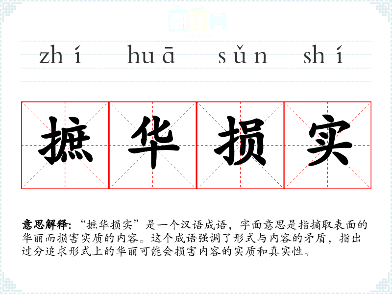 “摭华损实”是一个汉语成语,字面意思是指摘取表面的华丽而损害实质的内容。这个成语强调了形式与内容的矛盾,指出过分追求形式上的华丽可能会损害内容的实质和真实性。