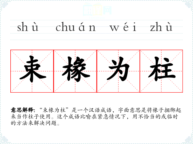 “束椽为柱”是一个汉语成语,字面意思是将椽子捆绑起来当作柱子使用。这个成语比喻在紧急情况下,用不恰当的或临时的方法来解决问题。