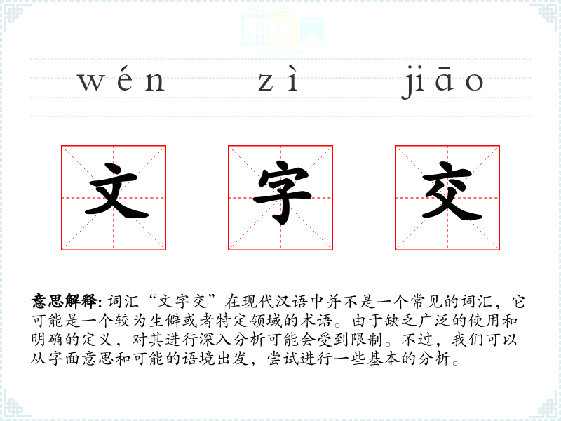 词汇“文字交”在现代汉语中并不是一个常见的词汇,它可能是一个较为生僻或者特定领域的术语。由于缺乏广泛的使用和明确的定义,对其进行深入分析可能会受到限制。不过,我们可以从字面意思和可能的语境出发,尝试进行一些基本的分析。