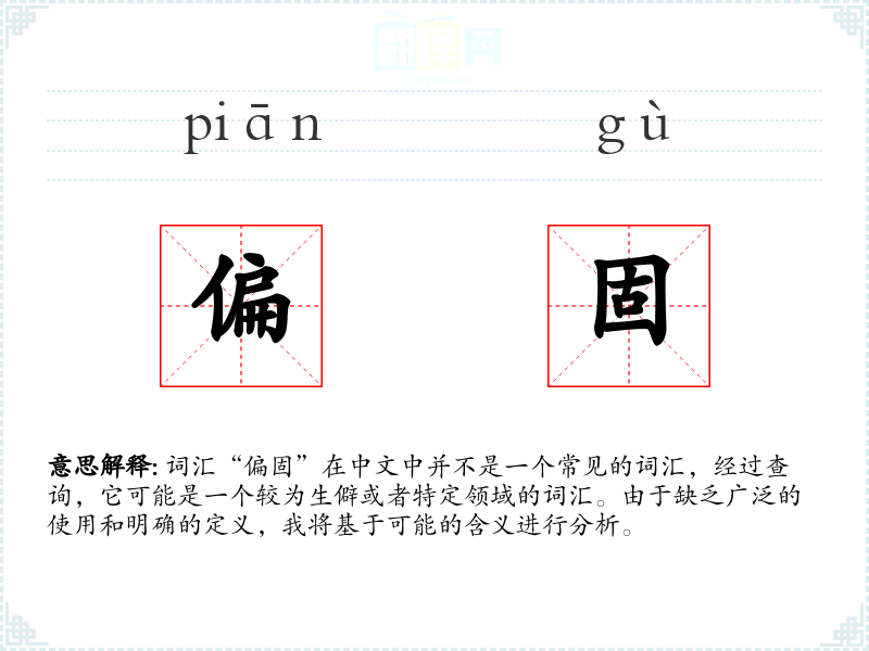 词汇“偏固”在中文中并不是一个常见的词汇,经过查询,它可能是一个较为生僻或者特定领域的词汇。由于缺乏广泛的使用和明确的定义,我将基于可能的含义进行分析。
