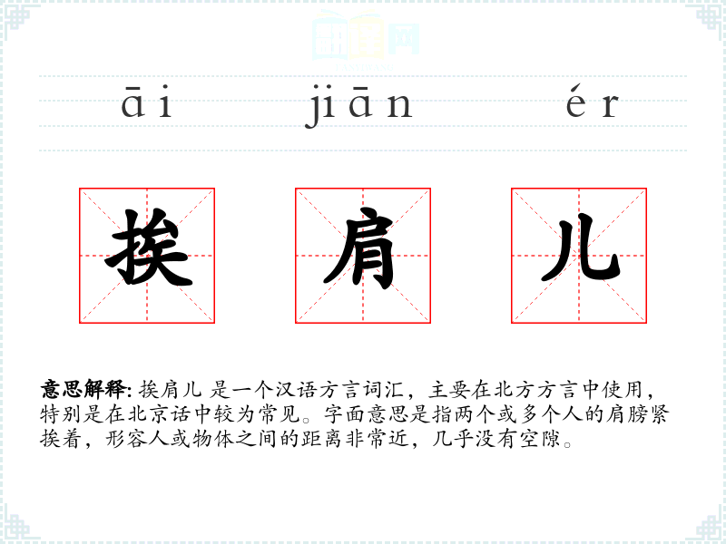 挨肩儿 是一个汉语方言词汇,主要在北方方言中使用,特别是在北京话中较为常见。字面意思是指两个或多个人的肩膀紧挨着,形容人或物体之间的距离非常近,几乎没有空隙。