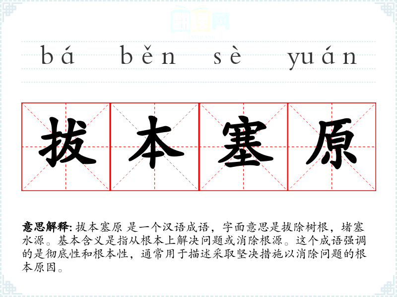 拔本塞原 是一个汉语成语,字面意思是拔除树根,堵塞水源。基本含义是指从根本上解决问题或消除根源。这个成语强调的是彻底性和根本性,通常用于描述采取坚决措施以消除问题的根本原因。