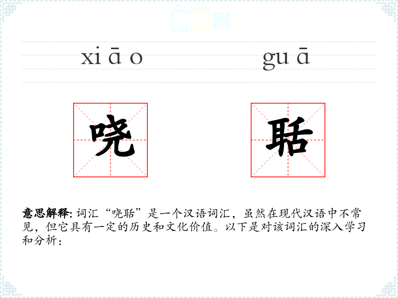 “哓聒”是一个具有特定文化背景和历史价值的词汇。虽然在现代汉语中不常见,但它丰富了汉语的表达方式。了解和学这样的词汇有助于更深入地理解汉语的文化内涵和历史演变。在语言学和表达中,适当地使用这样的词汇可以增加语言的多样性和深度。