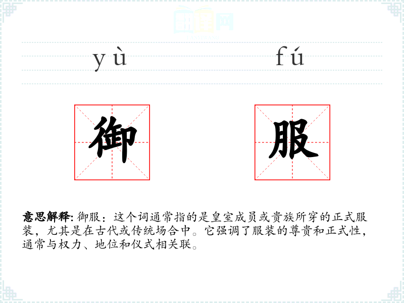 御服:这个词通常指的是皇室成员或贵族所穿的正式服装,尤其是在古代或传统场合中。它强调了服装的尊贵和正式性,通常与权力、地位和仪式相关联。